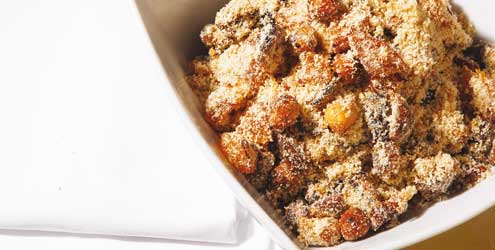 No liquidificador, bata bem os biscoitos até virar uma farinha. Reserve. Coloque em uma panela a margarina, a cebola, o alho, o azeite e sal. Refogue até dourar. Acrescente as azeitonas, as passas e o queijo ralado. Se gostar, pode colocar os damascos e os tomatinhos. Em seguida, adicione o biscoito batido e mexa bem.