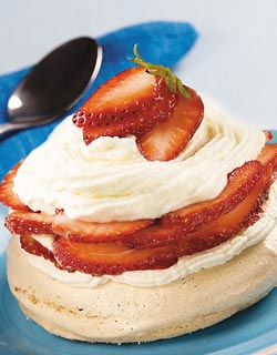Pique o morango e reserve alguns para decorar. Bata o creme de leite com o açúcar até ficar no ponto de chantilly. Ponha num saco de confeitar com bico pitanga. Em cima de cada suspiro coloque uma camada de chantilly. Sobre o chantilly coloque um pouco do morango picado. Finalize com outra camada de chantilly e decore com os morangos reservados. Sirva gelado.